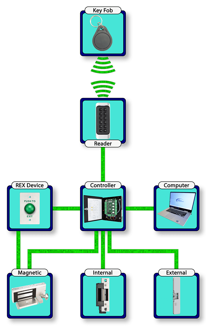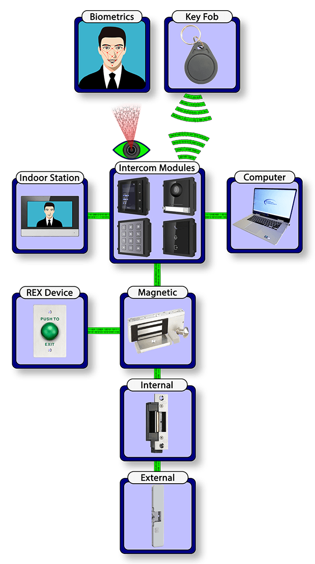 - One of the three (3) types of locking hardware and the Intercom device is installed at each entry point to be controlled. The intercom is capable of reading an RFID device, PIN input, and if you choose the option biometric data.